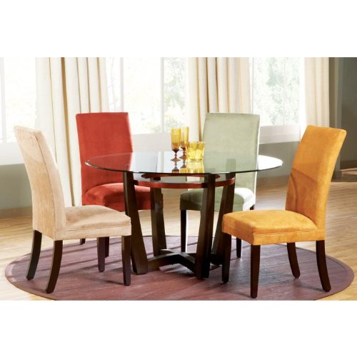 With its contemporary style the Norah dining set can easily fit into any décor and home. Round 54 glass table is ½ thick with a 1 bevel. The base is made of wood solids and is enhanced with a rich merlot finish. Top of the base is completed with a contrasting copper finish. Parsons chairs are upholstered in Microfiber and are available in an array of warm tones including mica, brick, chestnut and sage.