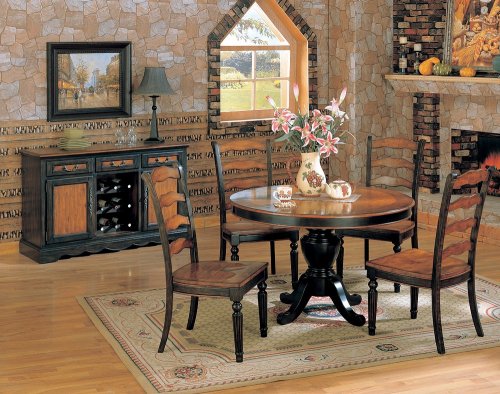 This is a 5-piece distressed two-tone brown and black. Make this item yours today to beautify the decor of your home. Set includes table and six side chairs. Item may require simple Table: 48"Dia X 30"H, Chair: 19"W X 21"D X 41"H Table: 48"-60"L 36"W 29"H, Chair: 16-1/2"L 18-1/2"W 38"H