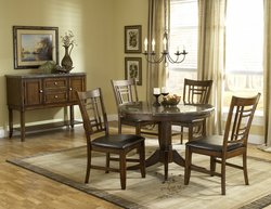 Patterson 5 Piece Round Dining Set. Transitionally designed with clean lines and right angles, the Patterson collection is a fresh addition to the Hillsdale Furniture dining assortment. Featuring your choice of a round pedestal or rectangle tapered leg table, the Patterson collection offers a rich marble top, a dark oak finish, a symmetrically constructed chair back with an easy to maintain versatile brown vinyl seat cover, and a solid wood and climate controlled wood composite construction. Designed to blend well into a traditional or transitional decor, and offered with two options to fit your unique spaces, the Patterson ensemble is a perfect addition to your home.FeatureRich marble topSymmetrically constructed chair backSolid wood and climate controlled wood composite constructionPerfect addition to your homeSet Includes(1) Patterson Round Dining Table (4) Patterson Side ChairsFinish: Dark OakDimension: Dining Table:30 (H) x 44 Diameter Side Chairs: 38½ (H) x 20½ (W) x 24 (D) Optional Server: 40 (H) x 19 (W) x 52 (L)