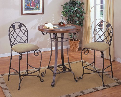 3pc Cherry & Brushed Gold Finish Metal Bar Table 2 Stool Set This is a brand new 3 pieces Bar Table Set. The set is designed with a distress cherry finish with slate inserts and brush gold metal finish and matching padded stools. Set includes Table and 2 bar stools. This elegant bar table set will complement the most sophisticated to casual decor. Make this item yours today to beautify the decor of your home. Item may require simple assembly. Specifications - Dimensions: Table: 36"Dia 42"H, Barstool: 21-1/2"W 19-1/2"D 46"H (29" Seat Height)