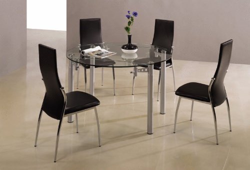 This five piece set stylish and modern dinning table is completed with a tempered glass top table and four high back chairs. Featuring the extendable sides on both ends, it is fit to meet your needs for nearly any occasion. Designed with the highest quality, the refreshing style of the table is able to modernize your dining area. Characterized by its blush sliver base and legs, its unique and trendy taste adds personality to any dining room. Have questions please call. Chairs also available in white.
