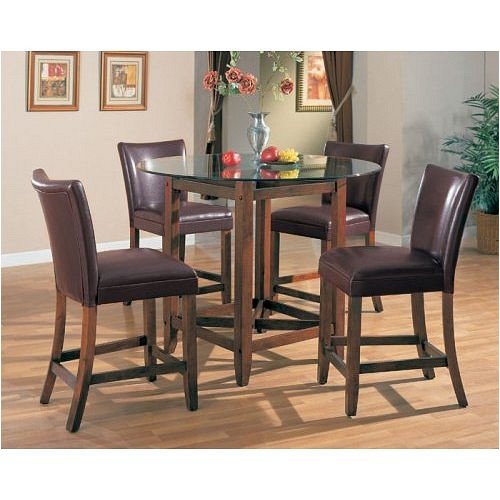The Round Counter Height Table features a 54" round glass table and strong, sturdy legs. The base is made of a solid wood base in a warm cherry finish. This is a beautiful table that will add flair to your dining room. This beautiful table is sure to add a nice touch to your home. This Coaster Furniture quality table is sure to last a lifetime. The barstools are 24" and are made of brown bi cast leather Includes a 54" round beveled glass top