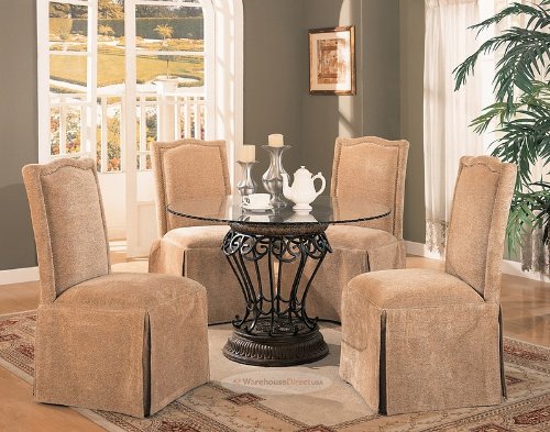 coaster's winning and elegant 5pc dining set makes great use of design. classy upholstered parsons chairs feature nail head trim and premium fabric. wrought iron base supports 45" rippled edge glass dining top. incredible price and stylish, sophisticated look. this stunning dining set will make any dining area electric. 5-piece set comes as shown with dining room table base and top, and four side parsons chairs.