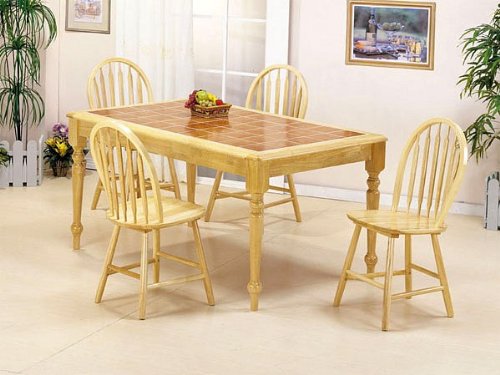 5 pc natural finish wood with terracota tile top dining table set , table measures 30" x 60" chairs 36" H at back.